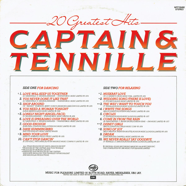 20 Grandes Éxitos de CAPTAIN & TENNILLE – 1980, compilación en LP de 20 pistas de sus grandes éxitos.